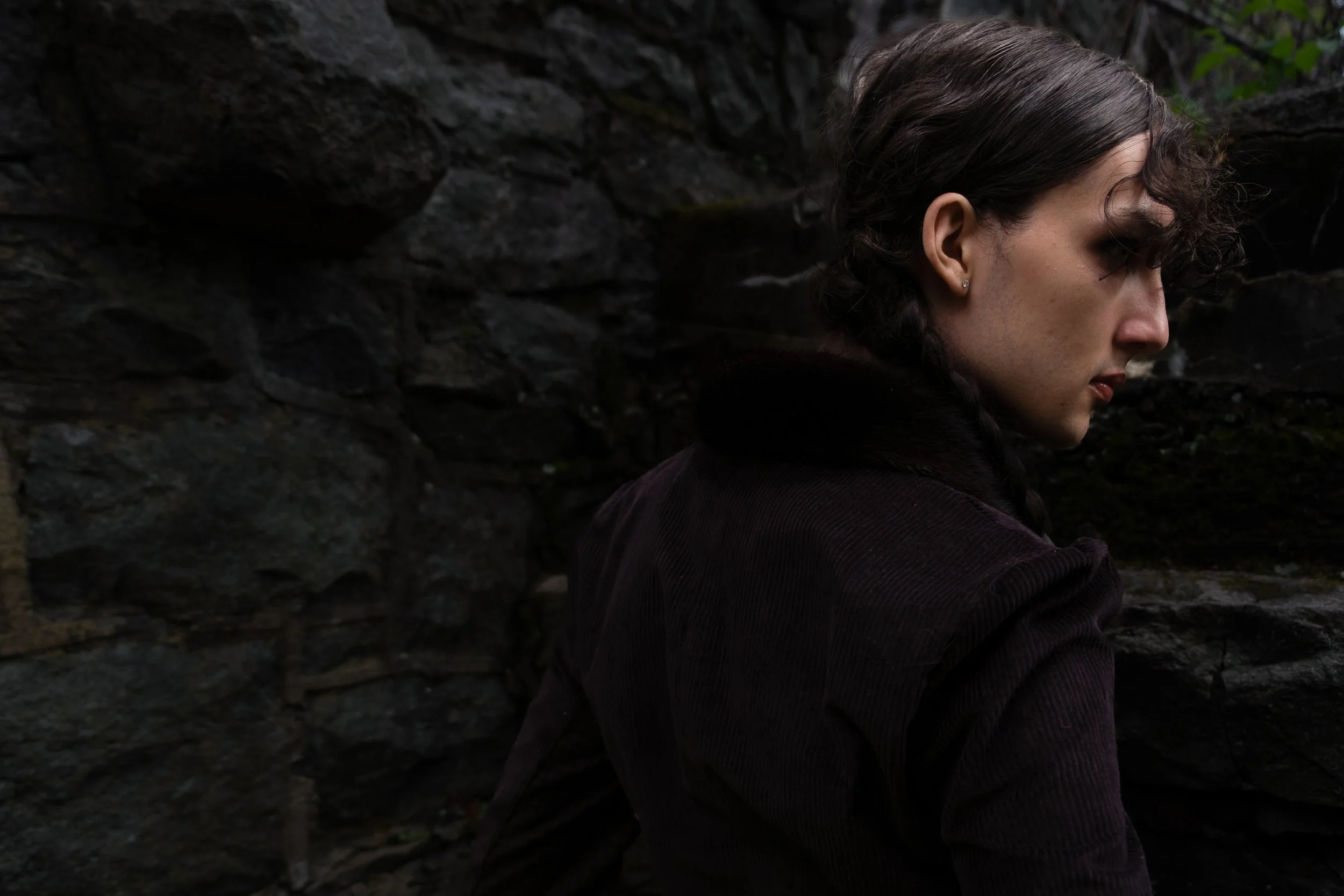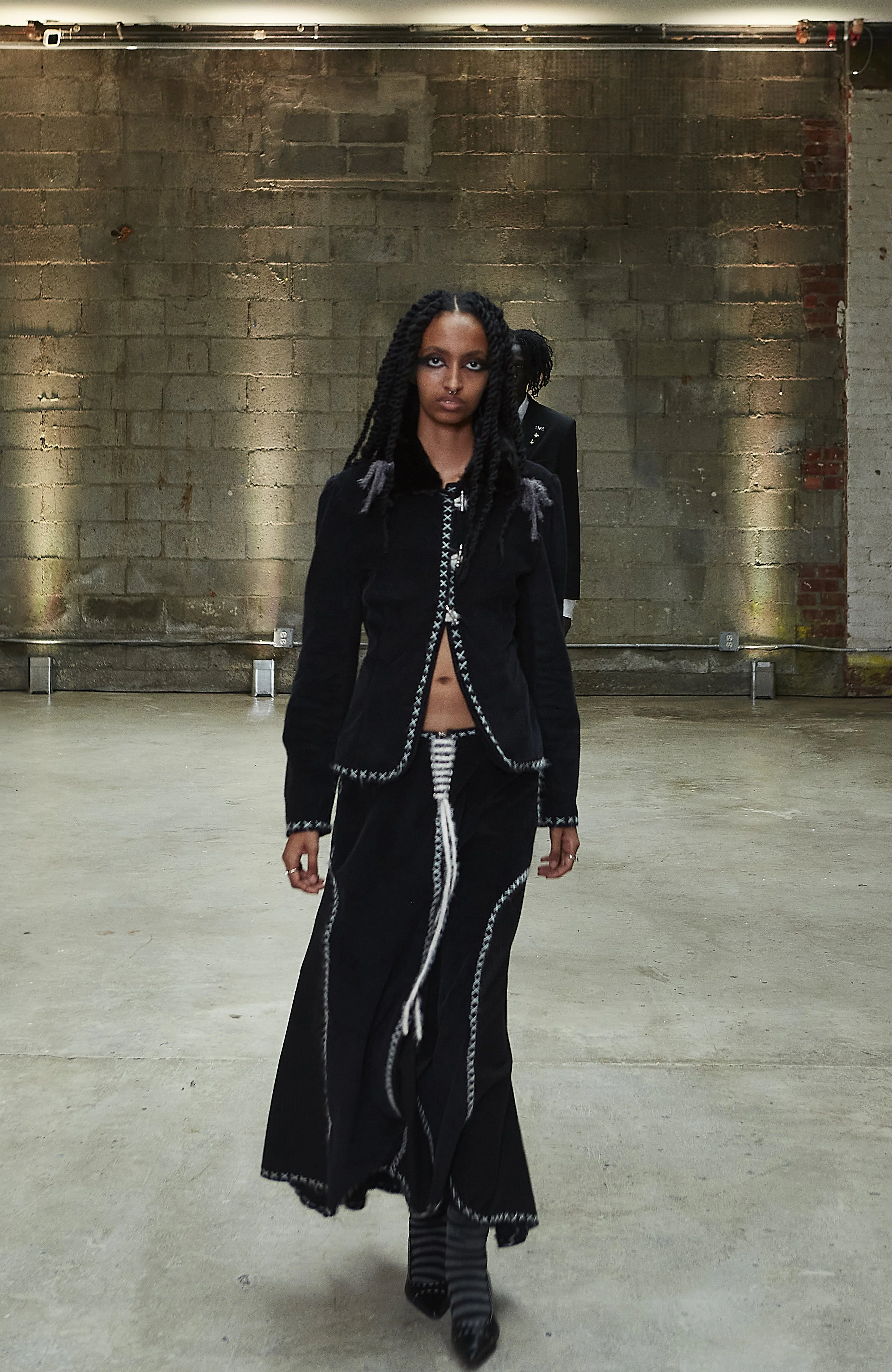 Corduroy, wool, and hand-stitched mohair set with mink fur collar. All trims hand-done and handmade.