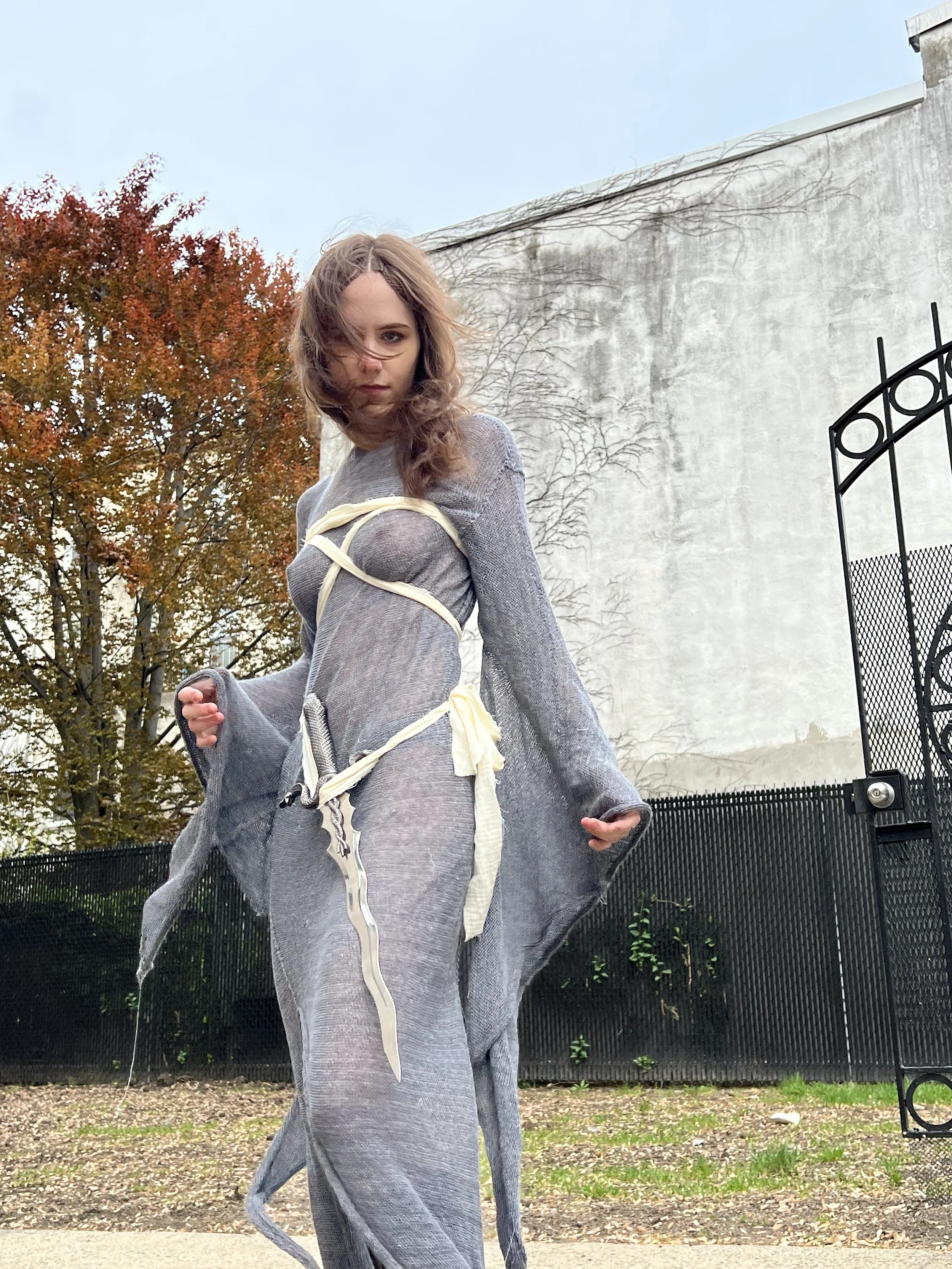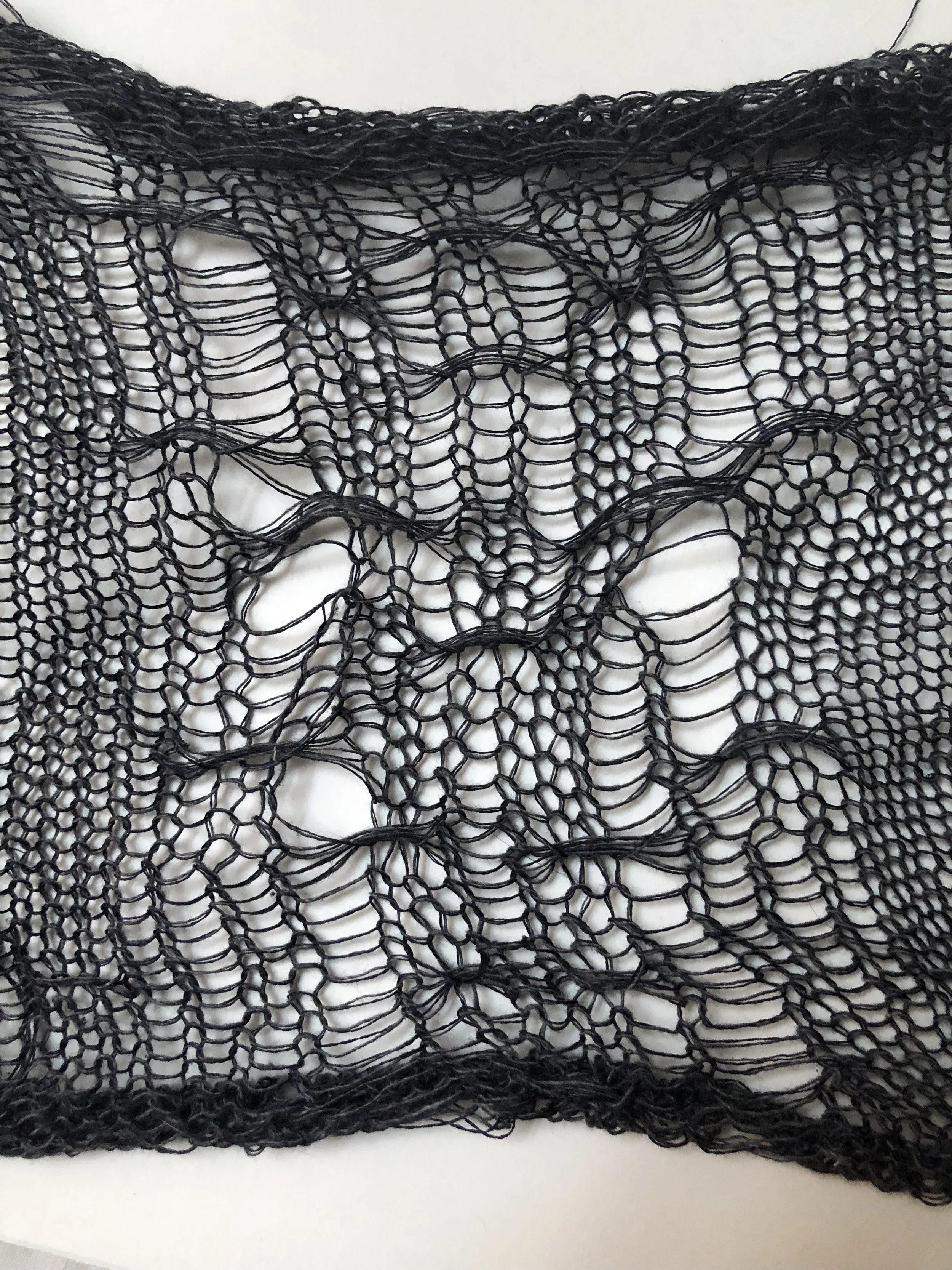 My knits are delicate like a breath of gossamer, holding complex patterns which are heavily inspired by the anatomical structures present in H.R. Giger’s work.